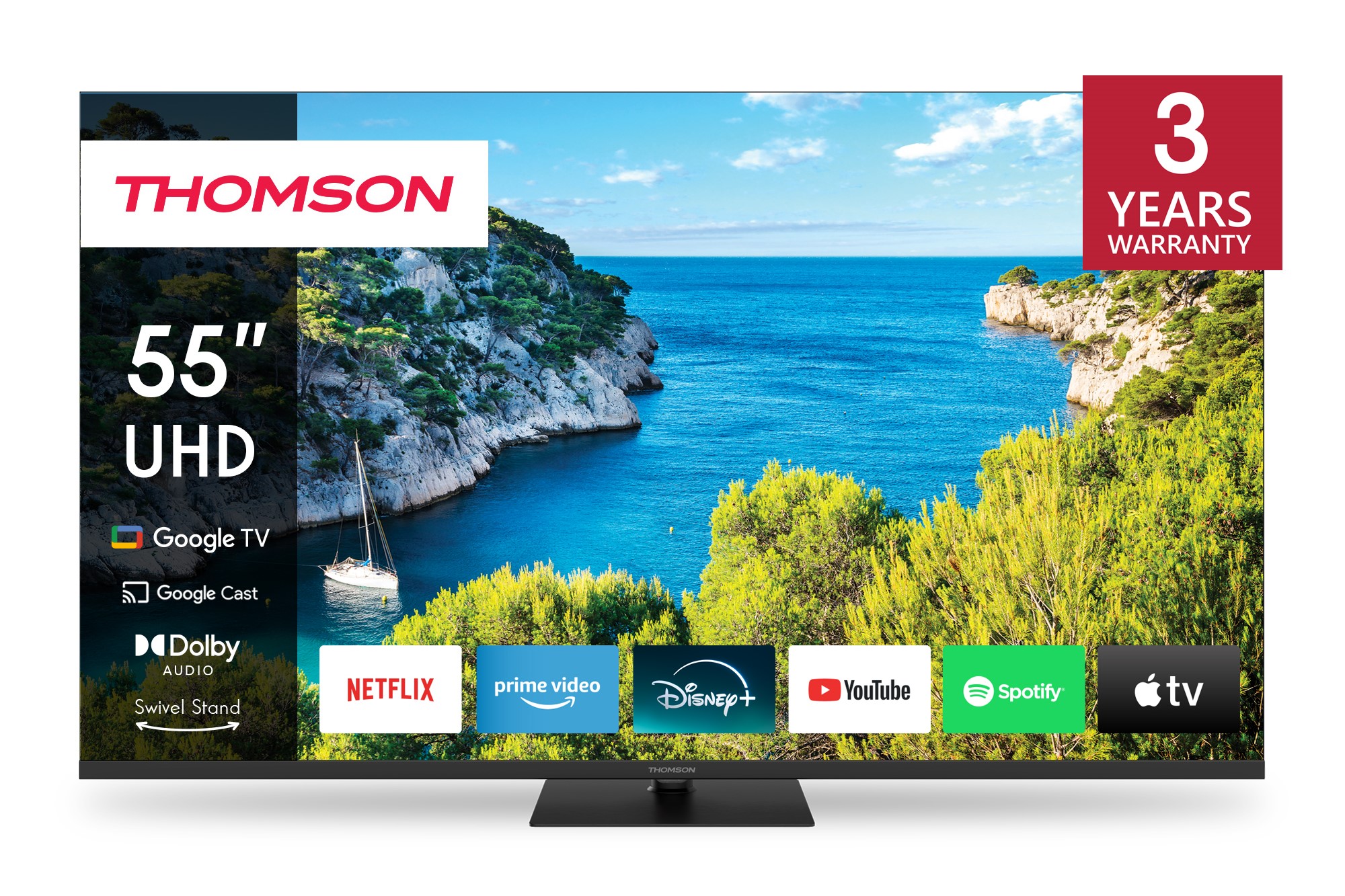IFFalcon U64:n tapaan Thomson UG5 on varustettu Google TV:llä, joten sovellusvalikoima on erinomainen ja käytettävyys selkeää. Kaukosäädin istuu mukavasti käteen, ja sen napeissa on miellyttävän pehmeä mutta tarkka tuntuma. Kaukosäätimessä on mikrofonikin, joten televisiota voi ohjata Google Assistant -puheohjauksella.