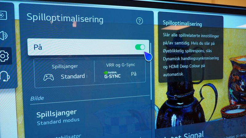 LG OLED G1 on toisaalta liitäntöjen puolesta huippuluokkaa. Siinä on neljä HDMI 2.1 -sisääntuloa, joten televisio osaa toistaa korkearesoluutioisia videolähteitä ja ennen kaikkea PS5:n ja Xbox Series X:n sisältöjä, jotka voivat toistua 4K-resoluutiolla 120 kuvaa sekunnissa. G1:ssä on myös AMD FreeSync- ja Nvidia G-Sync-tuki, joten pelaaminen onnistuu tökkimättä myös PC:n kautta. Vertailun vuoksi todettakoon, että Sony A90J -televisiossa on vain kaksi HDMI 2.1 -sisääntuloa eikä siinä ole yhtä kattavia peliominaisuuksia.