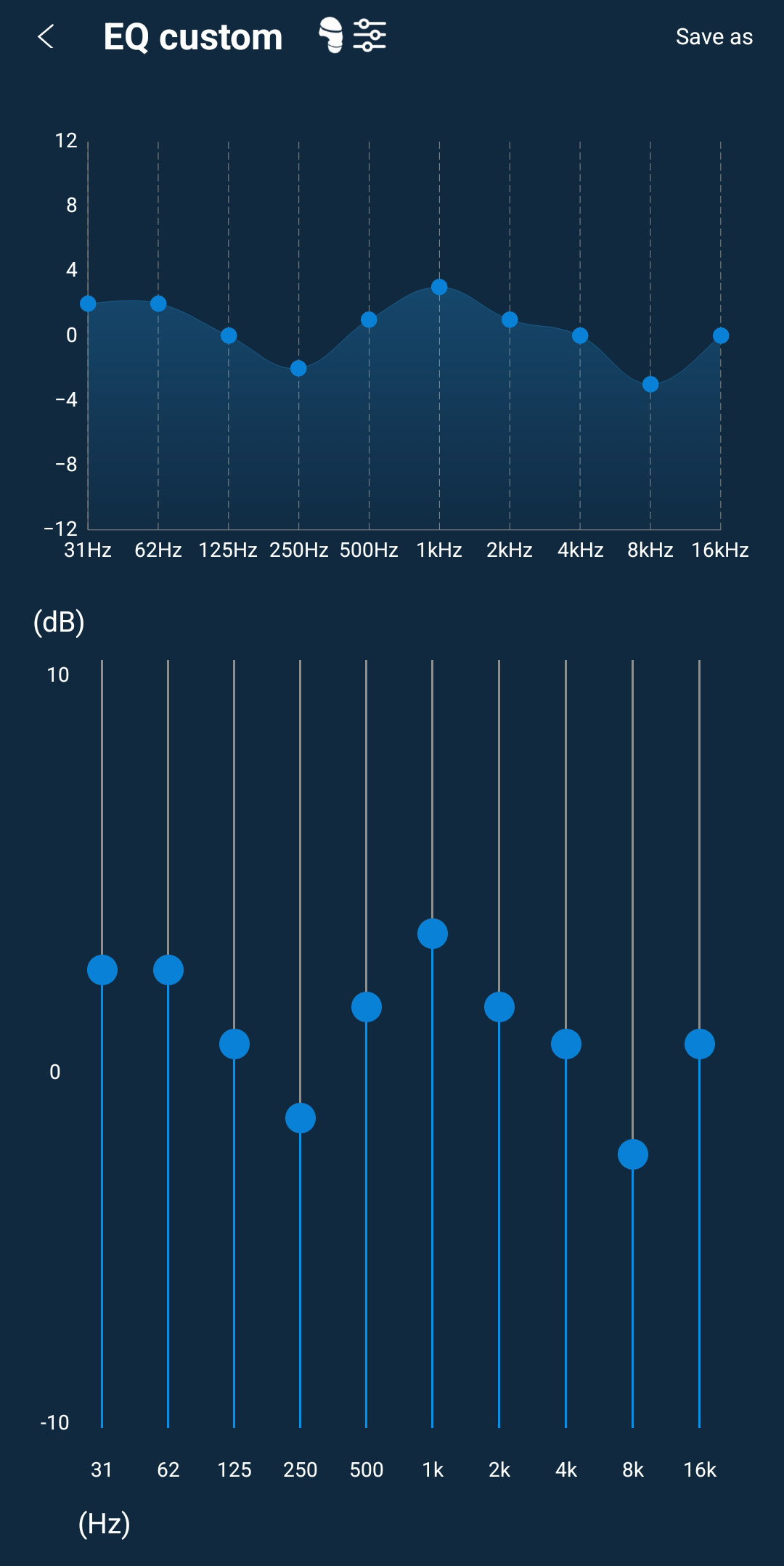 Noble-sovellus on yksinkertainen ja intuitiivinen, eikä toimintoja ole liikaa. EQ-asetukset tallentuvat suoraan kuulokenappeihin ja itse tehtyjä asetuksia voi tallentaa useita. Sovellus ei kuitenkaan anna koskea valmiisiin ääniprofiileihin. Joka kerta, kun teen muutoksia, on uudet säädöt tallennettava omaksi asetuksekseen. Onpa monimutkaista.