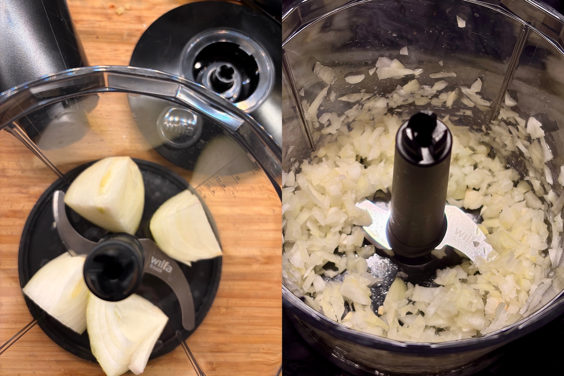 Wilfan vahvuus on lisävarusteiden määrässä, joten kone on Bamixia monipuolisempi. Sauvoja on tosiaan kaksi kappaletta: isommalla sekoitetaan isompia määriä, kuten keittoja ja smoothieita, ja pienempi sopii kastikkeiden ja vaikkapa majoneesin tekoon. Ja kuten mainittua, mukana on myös kaksoisvispilä kerma- ja valkuaisvaahdon vatkaamiseen.