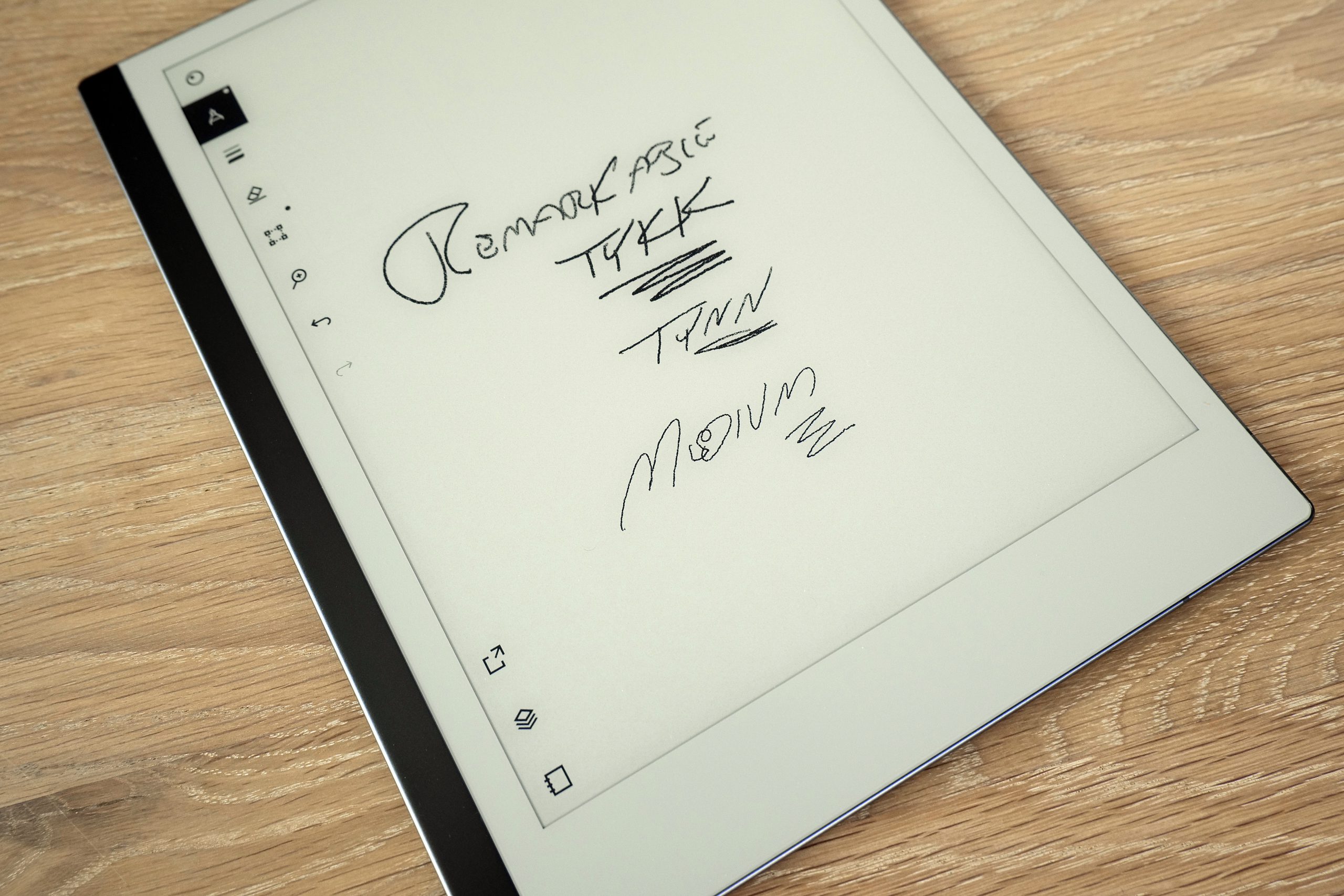 Tuntuu oudolta kirjoittaa näytölle, jonka pinta tuntuu silkkiseltä mattapaperilta. Ainakin jos on tottunut kirjoittamaan lasipintaiselle tabletille. Se vaatii hieman totuttelua, mutta kirjoitustuntuma on yllättävän hyvä myös verrattuna laadukkaaseen paperiin. Mustekynäharrastajat nyrpistelenevät Remarkable 2:lle, mutta meille muille laite on varsin käyttökelpoinen apuri, joka voi korvata monen käyttämän paperisen muistikirjan. Ja illan tullen digimuistio taipuu tablettikäyttöön – mahtava homma!