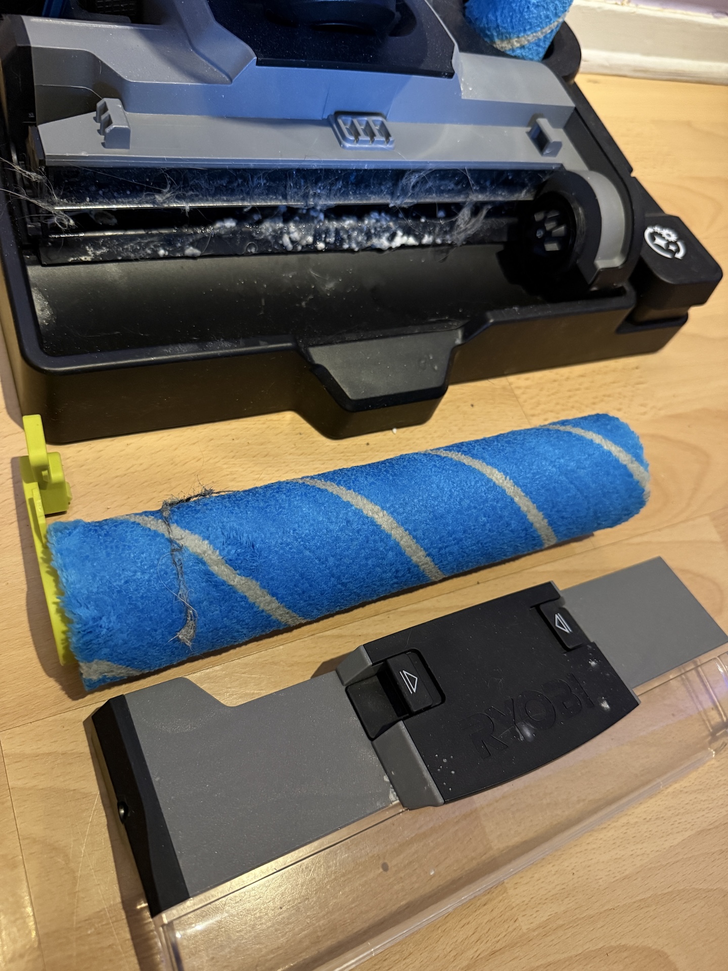 Vesisäiliöiden irrotus sujuu helposti. Molemmat säiliöt ovat konepestäviä, mistä iso plussa Ryobille. Likaa kuitenkin jää kiinni sinne tänne, joten säiliöitä on pyyhittävä myös käsin, ja jos likavesisäiliöön on jäänyt jotain iljettävää, jota ei halua kaataa viemäriin, se on kaiveltava käsin likaveden joukosta, mikä ei tunnu kovin mukavalta. Myös suuttimeen jää helposti mönjää, joten sekin on pyyhittävä harjaspäätä vaihtaessa. Kaiken kaikkeaan siivoamisesta jää sellainen tunne, että se aika, jonka on säästänyt lattiapesuria käyttäen tavallisen käsin moppauksen sijaan, häviää itse laitetta puhdistaessa.