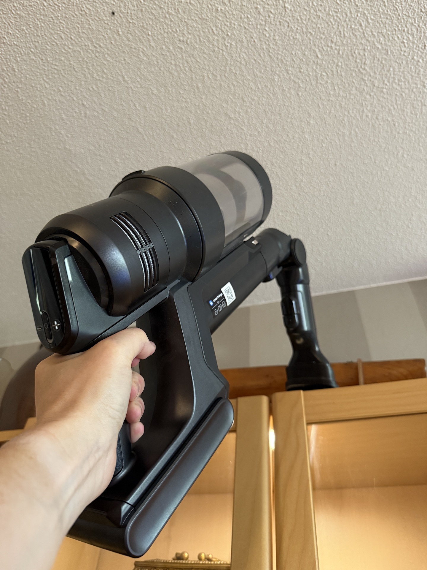 Ensimmäinen Bespoke Jet AI oli aika painava varsi-imuri, mutta uusi versio on onneksi 400 grammaa kevyempi eikä se tunnu tavallisessa käytössä mitenkään raskaalta. Suulakkeet ovat helppokäyttöisiä, etenkin kahdella nivelellä varustettu pienempi lattiasuulake. Flex Toolin ansiosta saa helposti imuroitua korkeiden hyllyjen ja kaappien päältä. Arvostan myös sitä, että varressa on teleskooppisäätö – se ei itse asiassa ole varsi-imureissa kovinkaan tavallista.