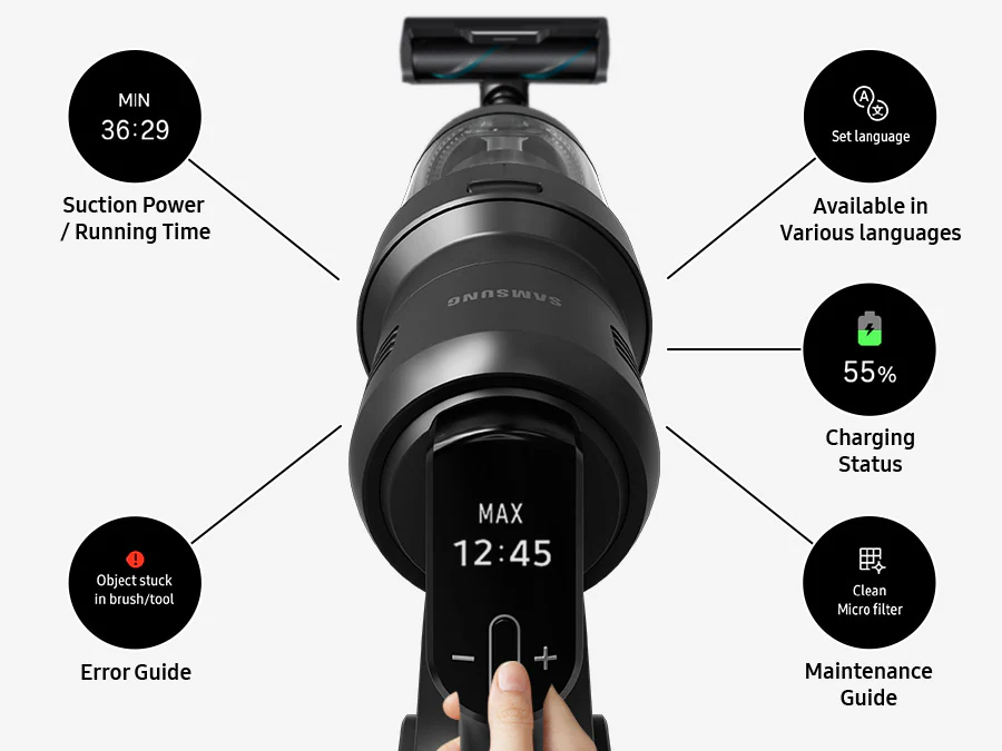 Kädensijassa on nappi, josta saa säädettyä imutehoa neliportaisella asteikolla tai valittua tekoälyasetuksen. Silloin imuri päättelee itse, mitä pintaa imuroidaan ja säätää imutehoa ja harjan nopeutta sen mukaan. Varsinaisen tekoälyn käyttö tässä yhteydessä herättää epäilyksiä, sillä muilla valmistajilla vastaava toiminto on nimeltään vain automaattitoiminto. Näytöltä näkee valitun asetuksen, akun varauksen ja ilmoitukset.