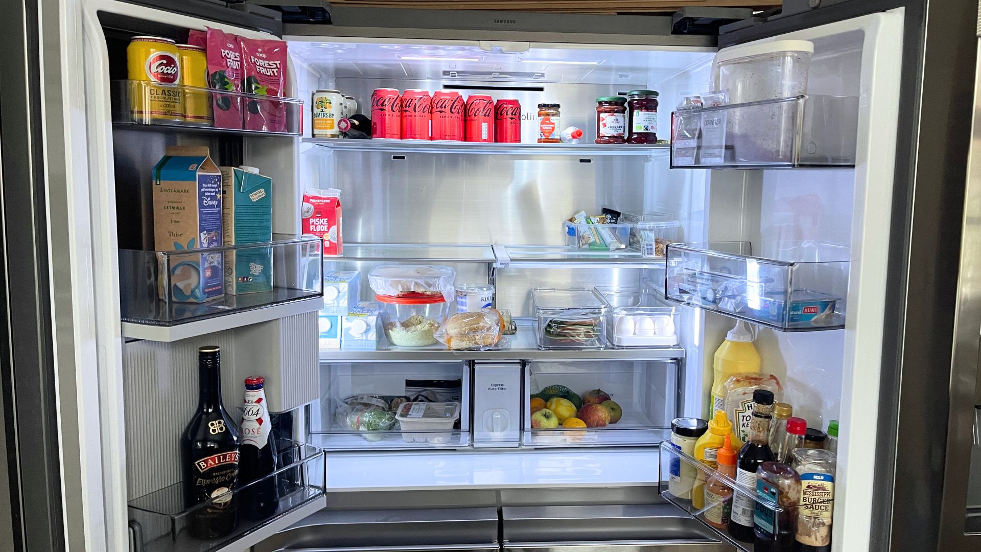 Family Hub on myös varsin tilava, ja ranskalaisten ovien ansiosta leveälle hyllylle saa sujautettua vaikkapa ison kakun, vaikka hyllyllä olisi jo edellispäivän lasagnevuoka. Muistan kerrankin, kun ostin pakastekalkkunan, jota en millään meinannut saada mahtumaan side-by-side-jääkaappiini sulamaan. Samsungin osuvasti nimetyllä Family Hub French Doorilla tätä ongelmaa ei ole.