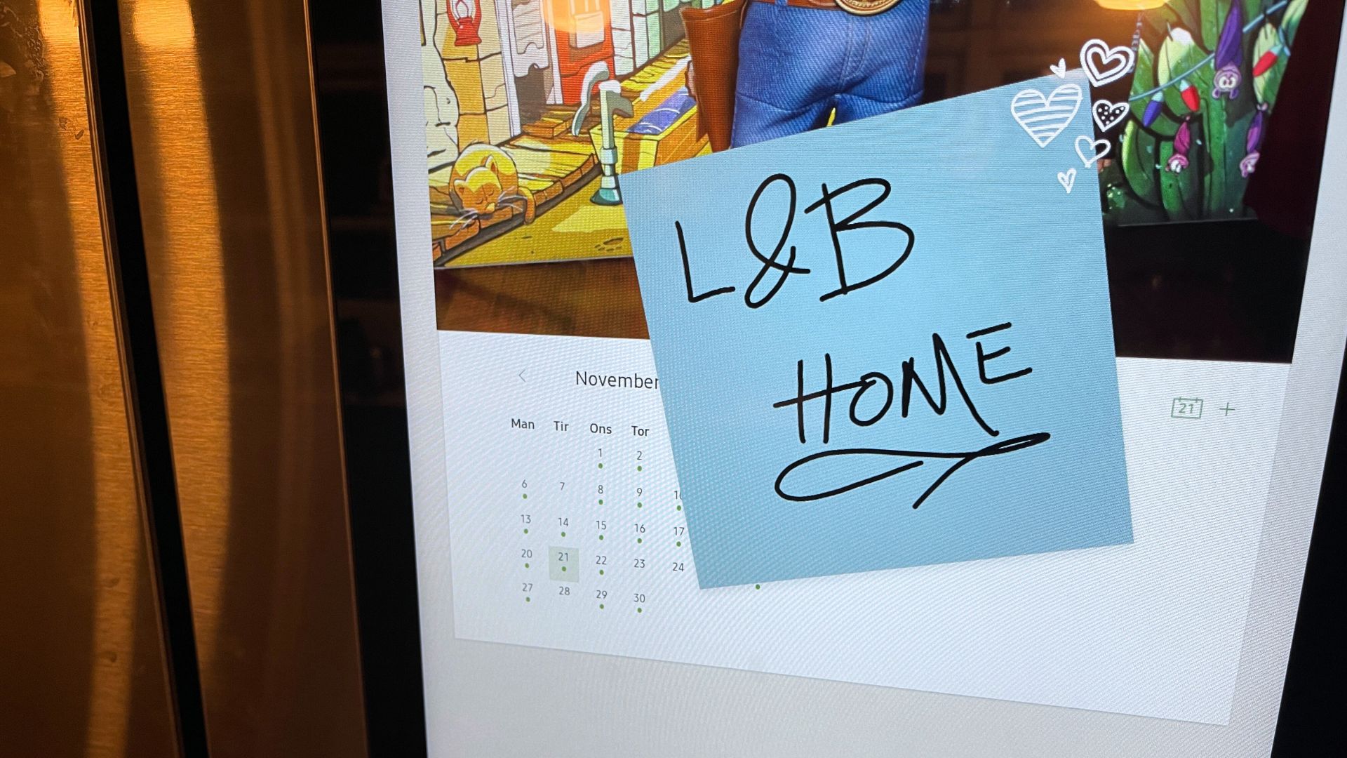 Samsung on keksinyt ratkaisun sotkun siivoamiseksi, ja se toimii! Tajusimme kotona, että paras valinta jääkaapin aloitusnäytöksi oli kalenterinäkymä päivän menoista ja tehtävistä (näyttö peilaa Googlen tai Outlookin kalenteria). Lisäsimme kalenterin teemaa söpön perhepotretin, joka sai näytön näyttämään henkilökohtaisemmalta. Google-kuvien kautta voi näytölle luoda myös kokonaisen kuvakarusellin vaikkapa perheen lomakuvista.