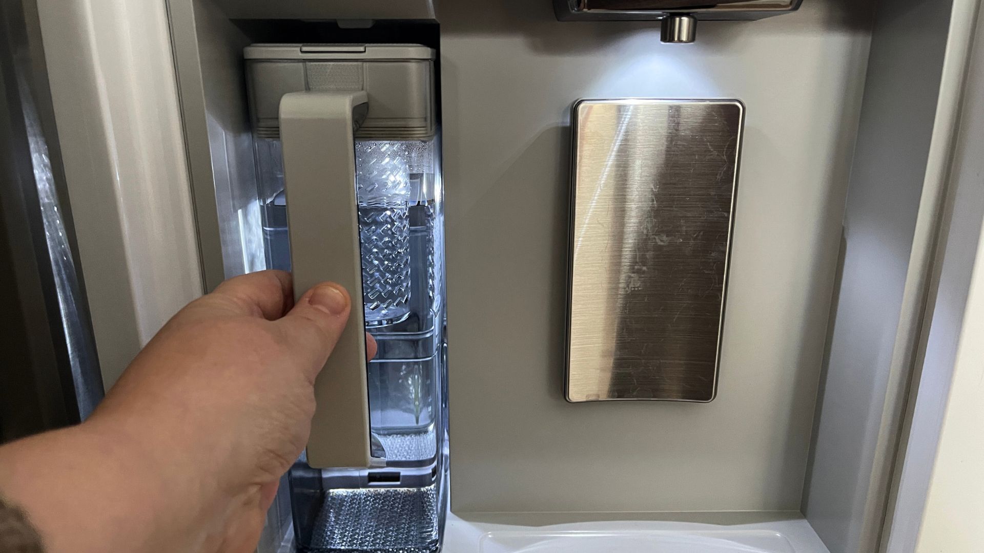 Samsung on ratkaissut ongelman yllättävän yksinkertaisella tavalla. Vesihanan viereen on nimittäin sijoitettu kannu, joka täyttyy automaattisesti. Se on kuin taikalähde, joka ei koskaan ehdy! Siitä tulikin nopeasti perheemme suosikki.