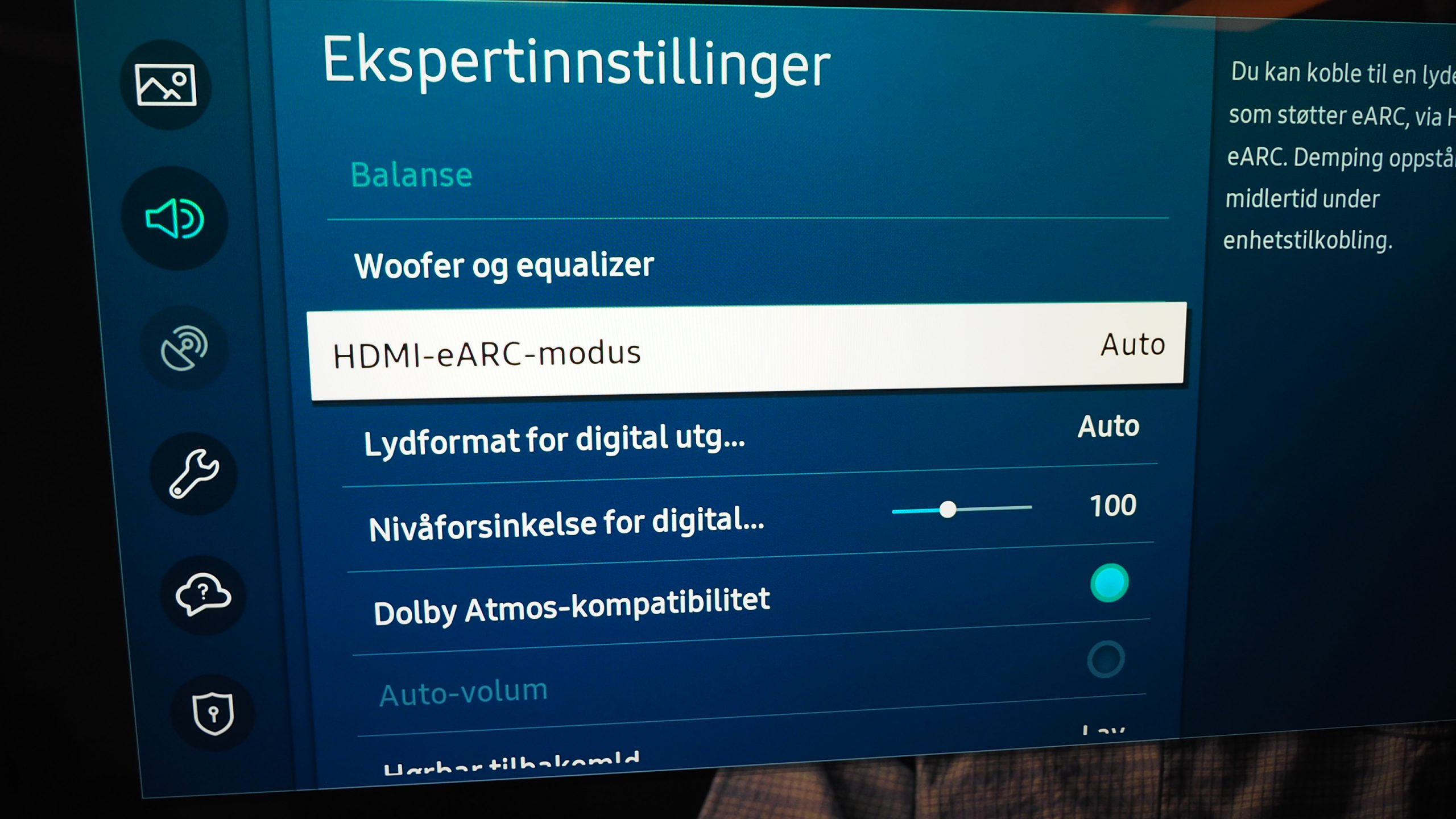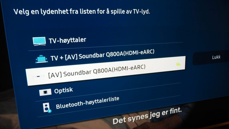 Käyttöönotto sujuu nopeasti ja HW-Q810 synkronoituu suoraan television kanssa (meidän tapauksessamme Samsung QN95A -mallin), kun soundbarin liittää HDMI-ulostuloon. Kannattaa tarkistaa valikosta, tukeeko oma tv eARC-liitäntää.