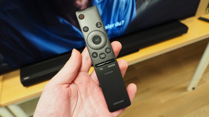 HW-Q810:n ja saman valmistajan television yhdistämisessä on pari erikoisetua. Uudemman Samsungin tv:n kanssa voi synkronoida kaukosäätimen niin, että television kaukosäädin käskee myös soundbaria. Soundbarilla on toki oma kaukosäätimensä sekä pieni näyttö, joka kertoo valitut äänilähteet ja asetukset.