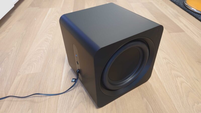 Toinen pakkauksesta löytyvä iloinen yllätys on langaton subwoofer. Se on saatavana mustana tai valkoisena, ja sekin on pieni kuin mikä: 24 x 24 x 24 cm. Silti se on välttämätön, jotta kaiutinjärjestelmästä saisi nimeksikään bassoa irti.