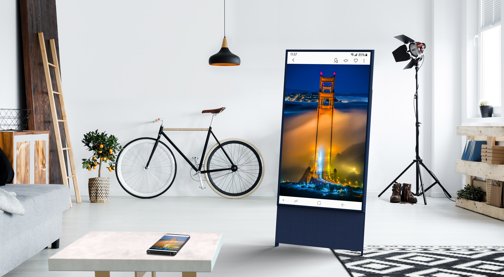 Samsung on keksinyt näppärän ratkaisun pulmaan. The Serossa on moottori, joka kääntää television vaaka-asennosta pystyyn ja toisinpäin vain yhdellä napinpainalluksella. Tavallisen televisionkatselun lisäksi sitä voi siis käyttää kännykän jatkeena: näyttää omia kuvia ja videoita tai selata Instagram-syötettä isolta ruudulta.