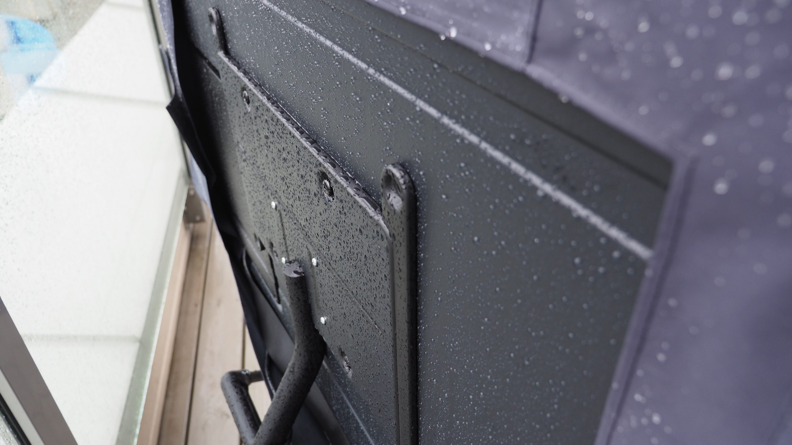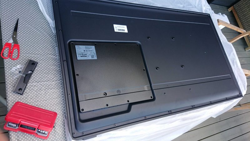 ”Terassi” on ensimmäinen testaamamme ulkotelevisio, ja heti ensikättelyssä käy ilmi, että kyseessä on varsin vankkatekoinen malli. 55-tuumainen komeus on verhoiltu mustaksi pulverimaalattuun metalliin ja painaa jämäkät 30 kiloa. Tämän luulisi kestävän kovempiakin kesätuulia.