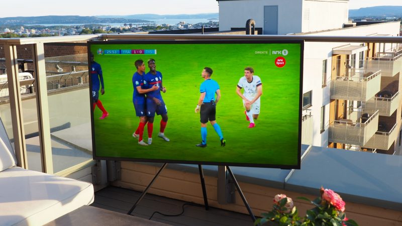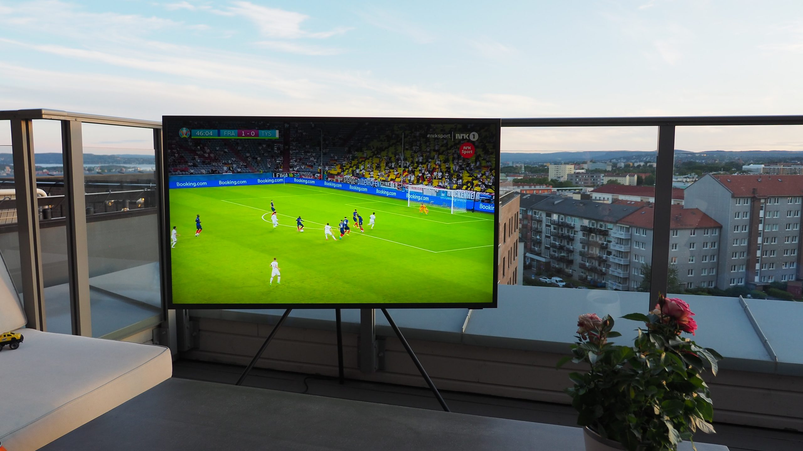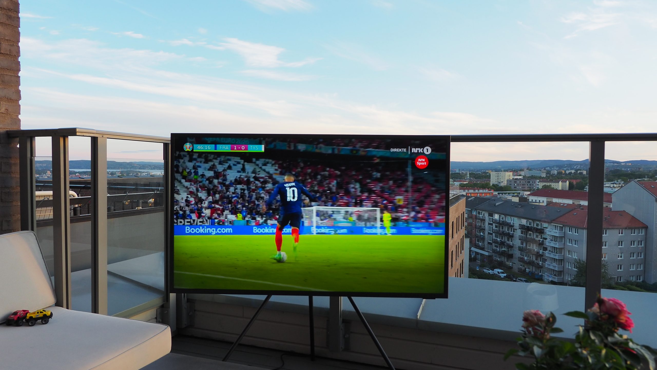 Koska The Terracen koko idea on ulkokatselussa, piti sitä tietenkin päästä kokeilemaan ulkona – eli allekirjoittaneen terassilla. Käytännöllinen sattuma oli, että television testaus ajoittui juuri jalkapallon EM-kisojen alkuun.