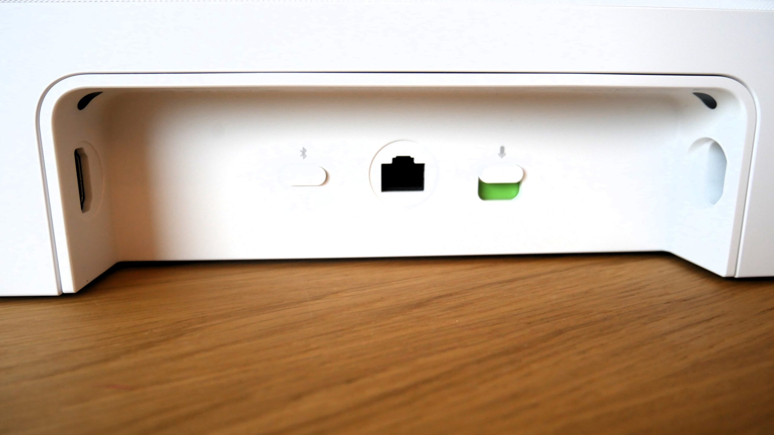 Ulkoa päin Sonos Arc Ultra näyttää erehdyttävän samalta kuin edellinen Arc, mutta lähempi tarkastelu paljastaa erojakin. Ultra on pari senttimetriä edeltäjäänsä leveämpi, ja useamman kaiutinelementin ansiosta suurempi osa pinnasta on perforoitu äänen kulun mahdollistamiseksi. Takapuolikin on uuden näköinen, ja sinne on sijoitettu nyt osa ohjaimista.