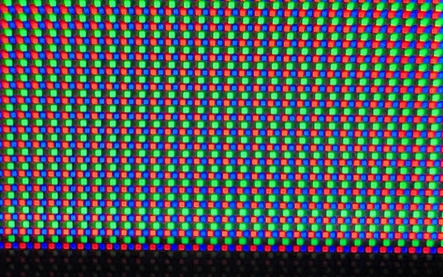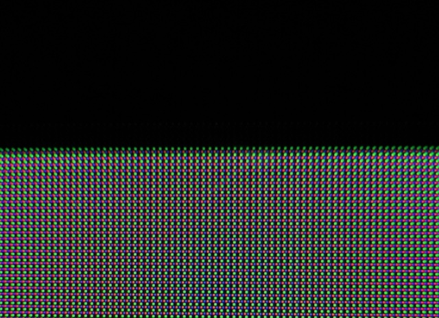 Kun QD-OLED-paneelia katsoo tarkemmin, huomaamme erottuvan pikselirakenteen. Sen sijaan, että pikselit olisivat tavalliseen tapaan vierekkäin, muodostavat punainen, vihreä ja sininen pikseli kolmion, jossa vihreä on aina ylhäällä. Kuvan sisällöstä ja katseluetäisyydestä riippuen tästä hivenen erikoisesta pikselikuviosta voi aiheutua kummia efektejä kuvaan.