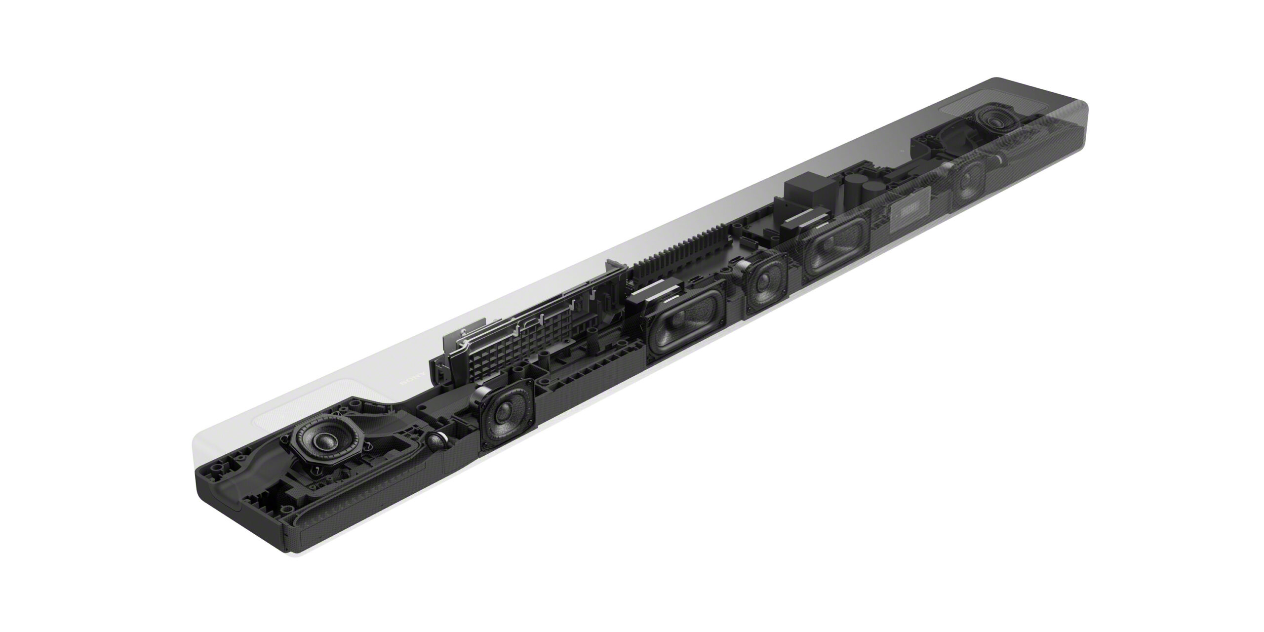 Vasen, oikea ja keskikanava ovat erillisinä kaiuttiminaan, samoin kuin päällä olevat kaksi korkeuskanavaa. Ne toistavat korkeus- ja surroundkanavien ääniefektit, ja edistyksellisen äänenkäsittelyn (360 Spatial Sound Mapping) ansiosta surround-äänikuvan pitäisi olla laaja ja tuntuva – ainakin teoriassa.