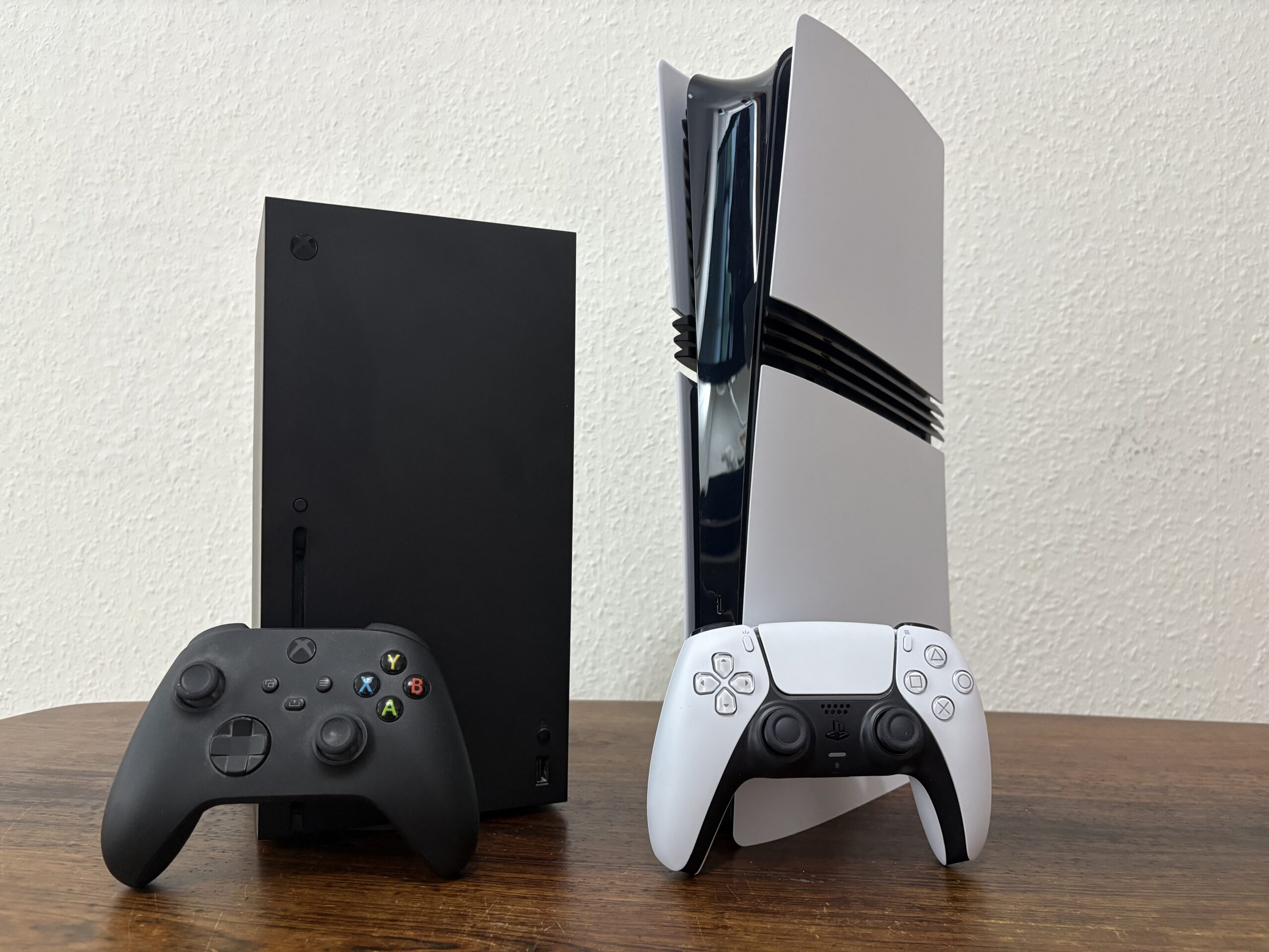 PlayStation 5 Pro ja Xbox Series X. Kumpikin vie aika lailla tilaa tv-tasolla litteän tv:n Kuva: Mikael Hansen