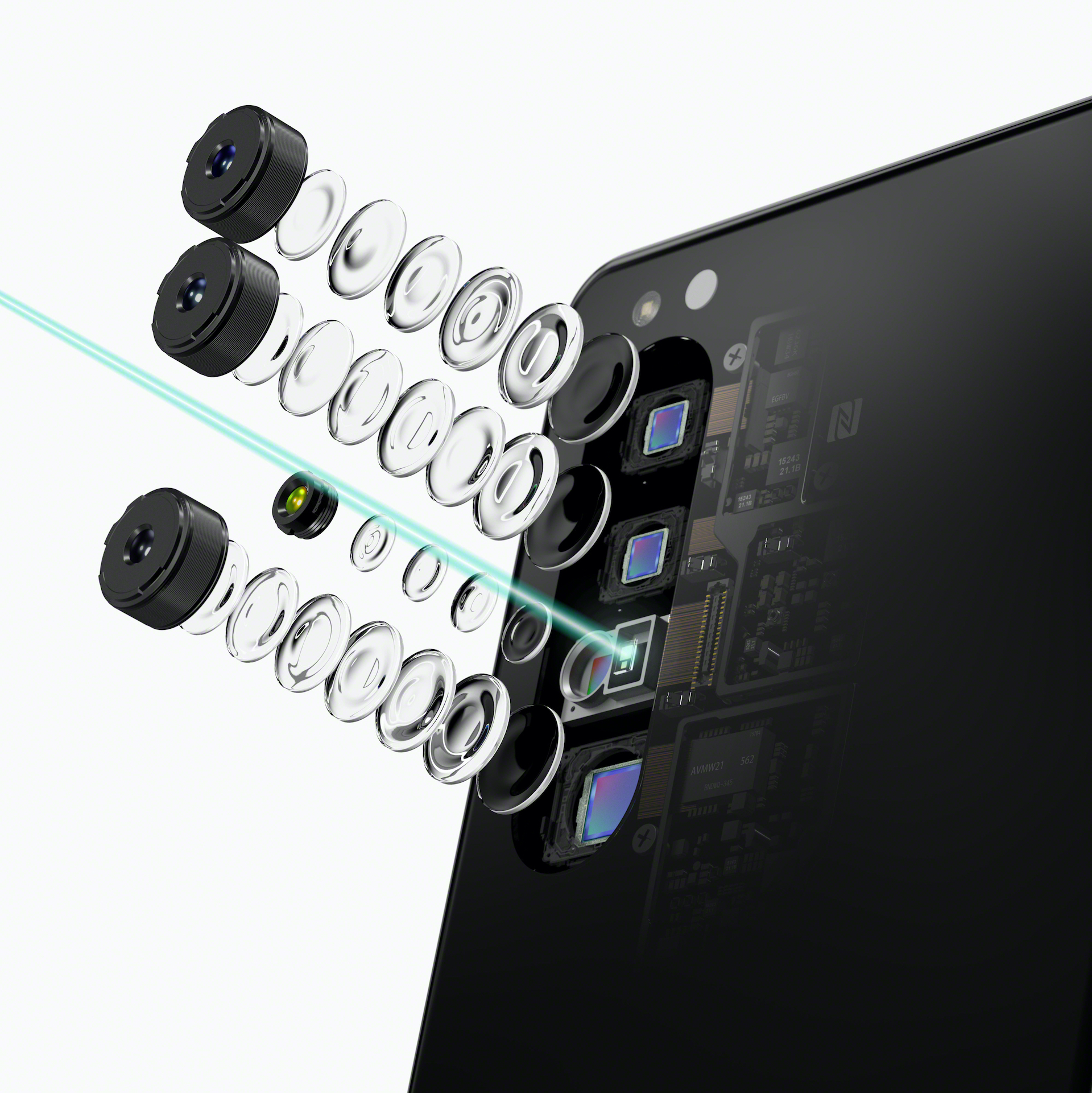 Sonyn uudessa puhelimessa on kolme Zeiss-optiikalla varustettua objektiivia, ja neljäs, jossa on etäisyyttä mittaava 3D iToF-linssi. Kuva: Sony