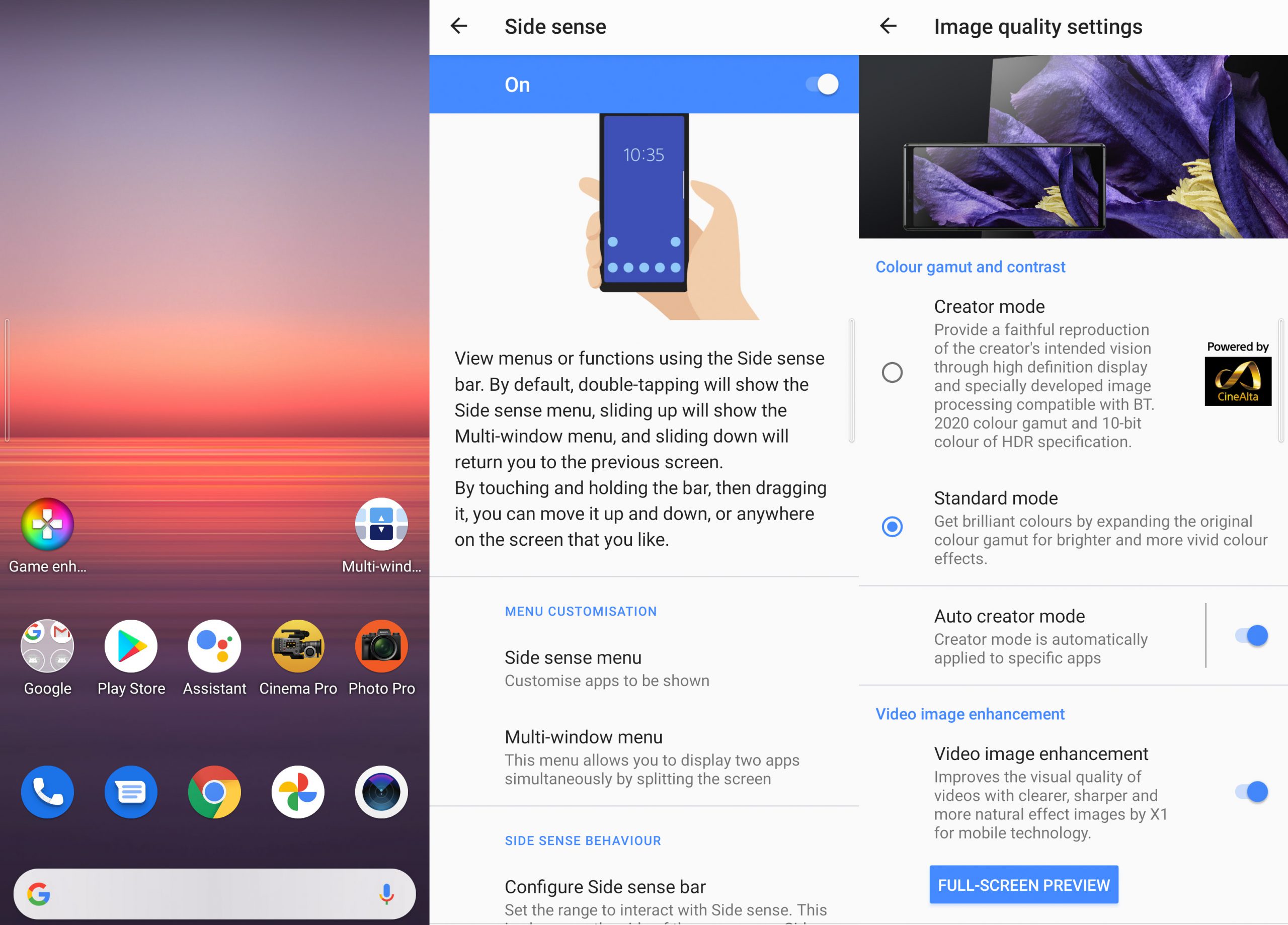 Saadakseen kaiken irti pitkästä ja kapeasta näytöstä on Sony lisännyt muutaman näppärän ominaisuuden. Näytön jakamiselle on oma järjestelmänsä, eli ei tarvitse pitää kahta sovellusta samanaikaisesti päällä. Sivuvalikon yleisimpine sovelluksineen ja asetuksineen saa esiin peukalon pyyhkäisyllä. Tätä lukuun ottamatta Sony pitäytyy selkeässä ja Android 10 -standardin mukaisessa ilmeessä. On vain kestettävä se, että valitettavasti puhelimessa on valmiina paljon Sonyn omia sovelluksia ja valitettavasti myös joitakin kolmannen osapuolen sovelluksia.