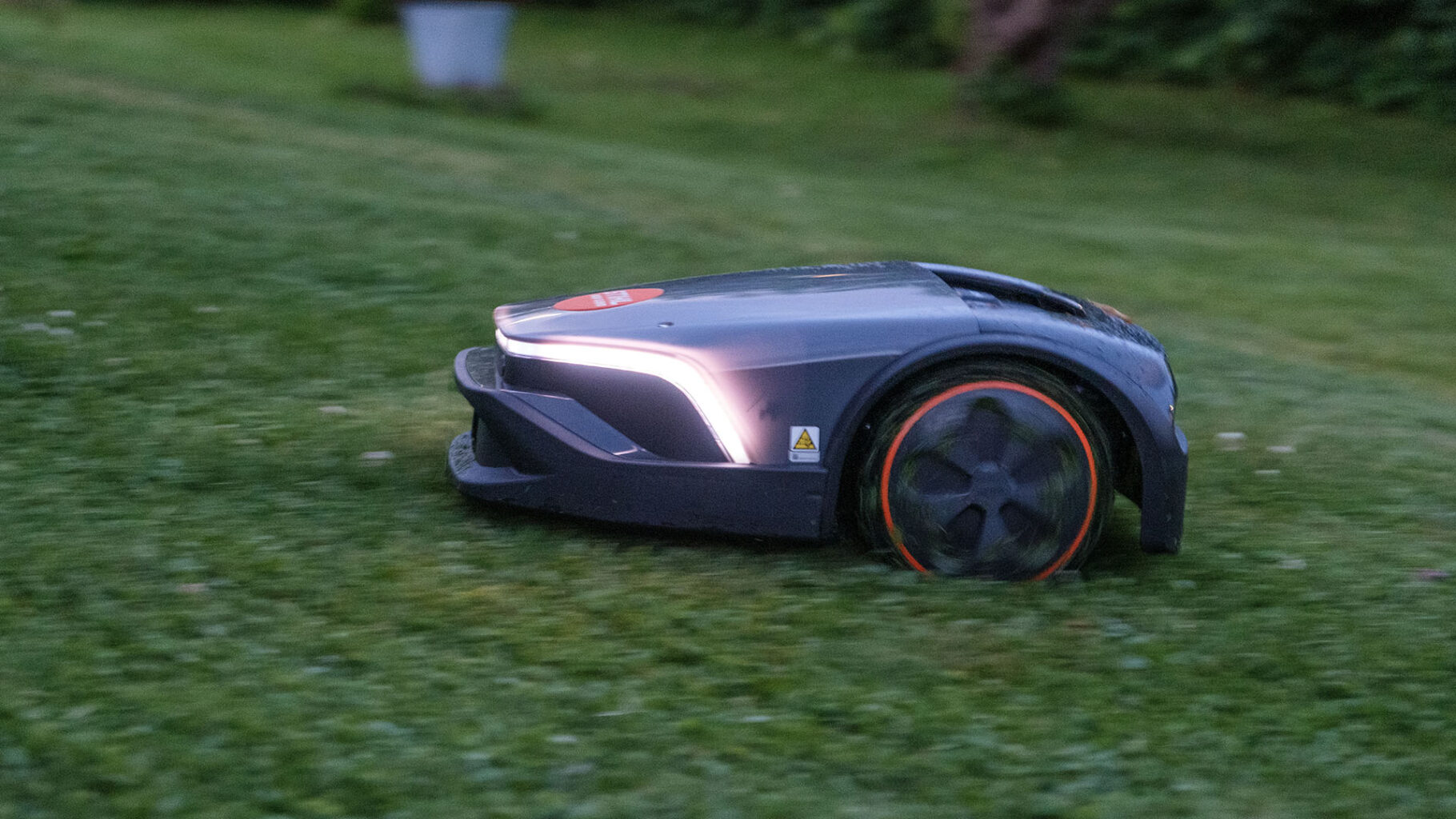 Ruohonleikkurissa ei ole näyttöä, mutta ajovalot valaisevat työtä ja auttavat näkemään laitteen syysiltoinakin pimeällä pihalla.