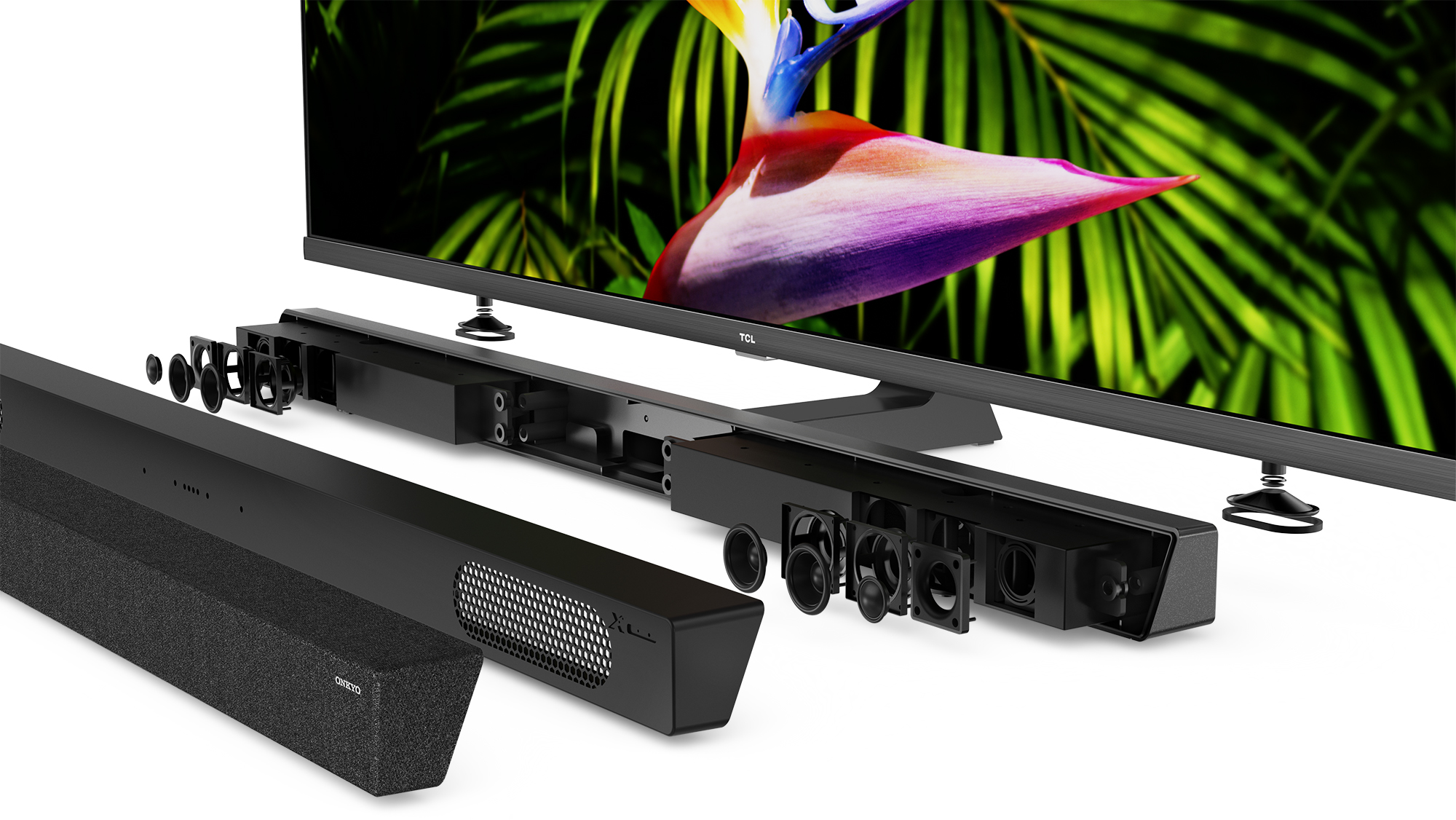 TCL:n televisio on varustettu soundbarilla, joka toimii myös jalustana. Muotoiluidea muistuttaa siis aiemmin testaamastamme Philips OLED935:stä, mutta tällä kertaa äänestä vastaa Onkyo! X10 toistaa äänet kevyesti ja kirkkaasti, ja puhe ja ääniefektit erottuvat selkeinä. Bassontoisto sen sijaan ei ihastuta, se olisi saanut olla syvempää ja täyteläisempää. Kun tv:n sijoittaa seinälle tai heti sen eteen, saa kaiutin taustatukea bassolle. Onkyon soundbarin saa halutessaan irti, joten sen voi korvata jollakin toisellakin mallilla.