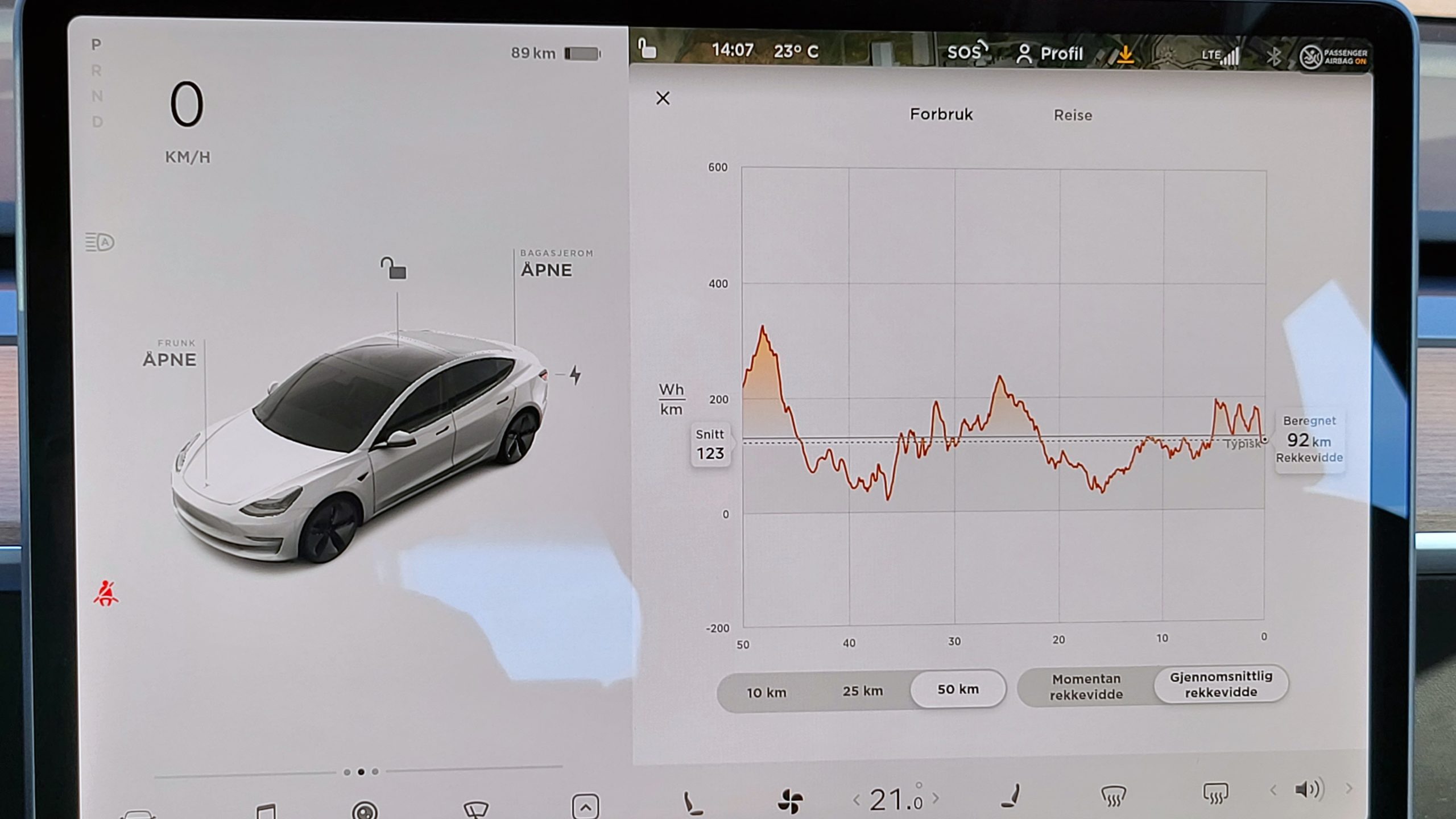 Erittäin energiatehokkaan Teslan keskikulutus jäi noin viikon ajoittain melko hektisenkin ajelun jälkeen alle 14 kW/100 km. Useimmat täyssähköautot ovat samanlaisella ajotyylillä keskikulutukseltaan noin 17–20 kW/100 km.