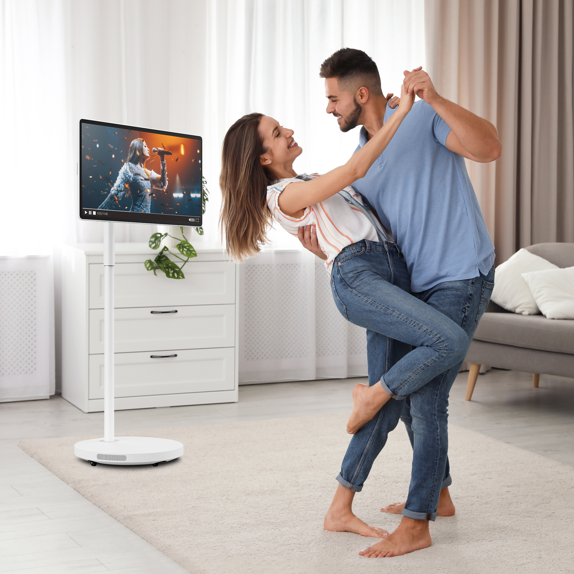 Go Plus Pro liikkuu kevyesti ja vakaasti, kun sitä rullailee lattian poikki. Akku on sijoitettu jalustan pohjaan, josta tv:n saa tarvittaessa kytkettyä myös pistorasiaan. Akun ansiosta laitetta voi käyttää pisimmillään neljä tuntia – täydellinen tv keittiöön, työhuoneeseen tai makuuhuoneeseen.