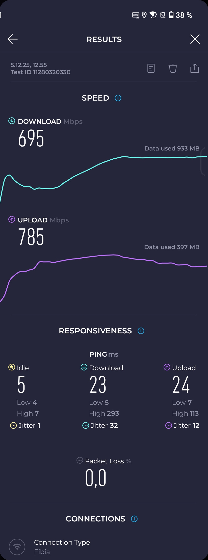Olohuoneessa, käsivarren mitan päässä Archer BE450 -reitittimestä, oli teoreettisen gigabtti-yhteyden nopeus 695 Mbit/s. Nopeus on oikein hyvä muttei ennätyksellinen. Oma Google Nest WiFi Pro -järjestelmäni pääsee samoissa olosuhteissa 850 Mbps:n nopeuteen.