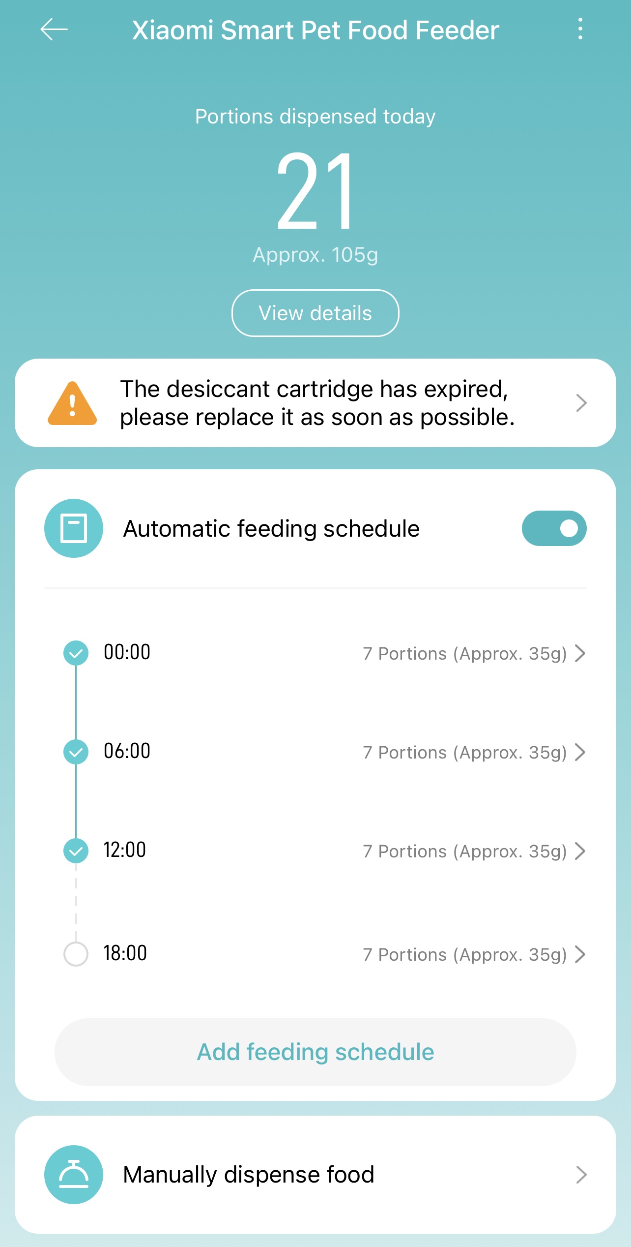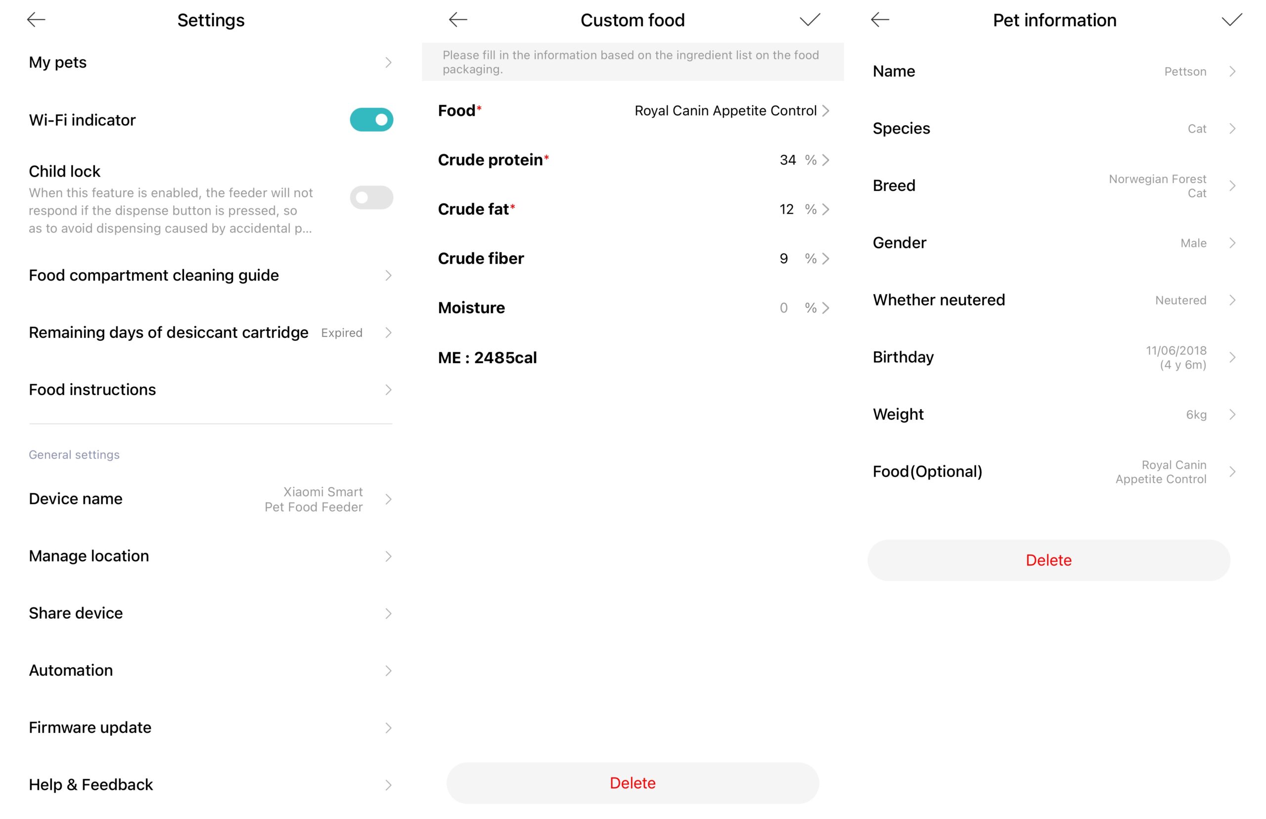 Käyttöönotto Xiaomin älykotilaitteille tarkoitetussa Mi Home -sovelluksessa sujuu helposti. Laite yhdistetään verkkoon, valitaan sille huone ja ohjelmoidaan omalle lemmikille. Minun piti kertoa kissani ikä, paino, rotu, sukupuoli ja tieto siitä, onko se leikattu vai ei. Seuraava vaihe oli vieläkin yksityiskohtaisempi, sillä minun piti näpytellä sovellukseen käyttämäni kissanruuan ravintosisällöt. Sen jälkeen sain suosituksen annoskoosta, joka oli hyvin lähellä manuaalisesti laskemaani määrää. Se loi uskoa järjestelmän luotettavuuteen. Lopuksi valitsin ruokintojen määrän ja kellonajat. Helppoa.