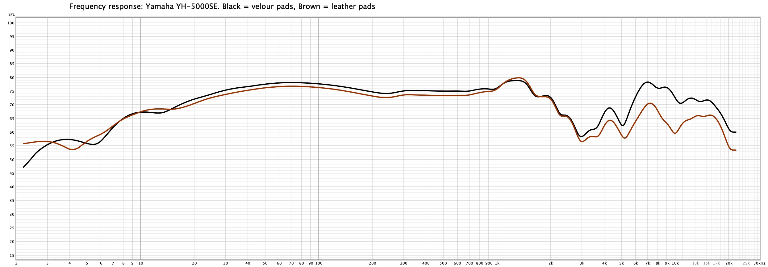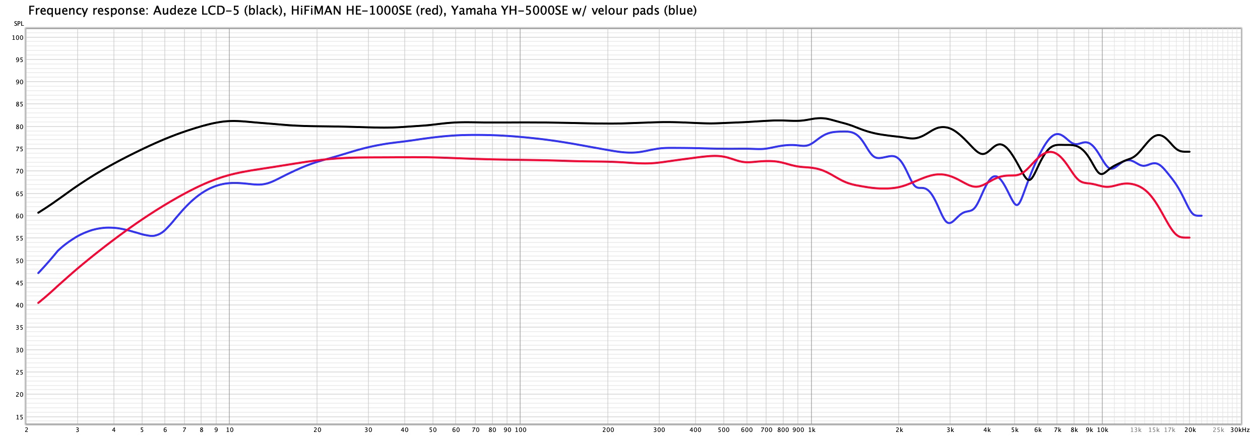 Yamaha YH-5000 (sininen) on taajuusvasteeltaan epätasaisempi kuin Audeze LCD-5 (musta) ja HiFiMAN HE-1000se (punainen). Mittaukset tehy REW-ohjelmistoa ja miniDSP E.A.RS. -mikrofonipäätä käyttäen.